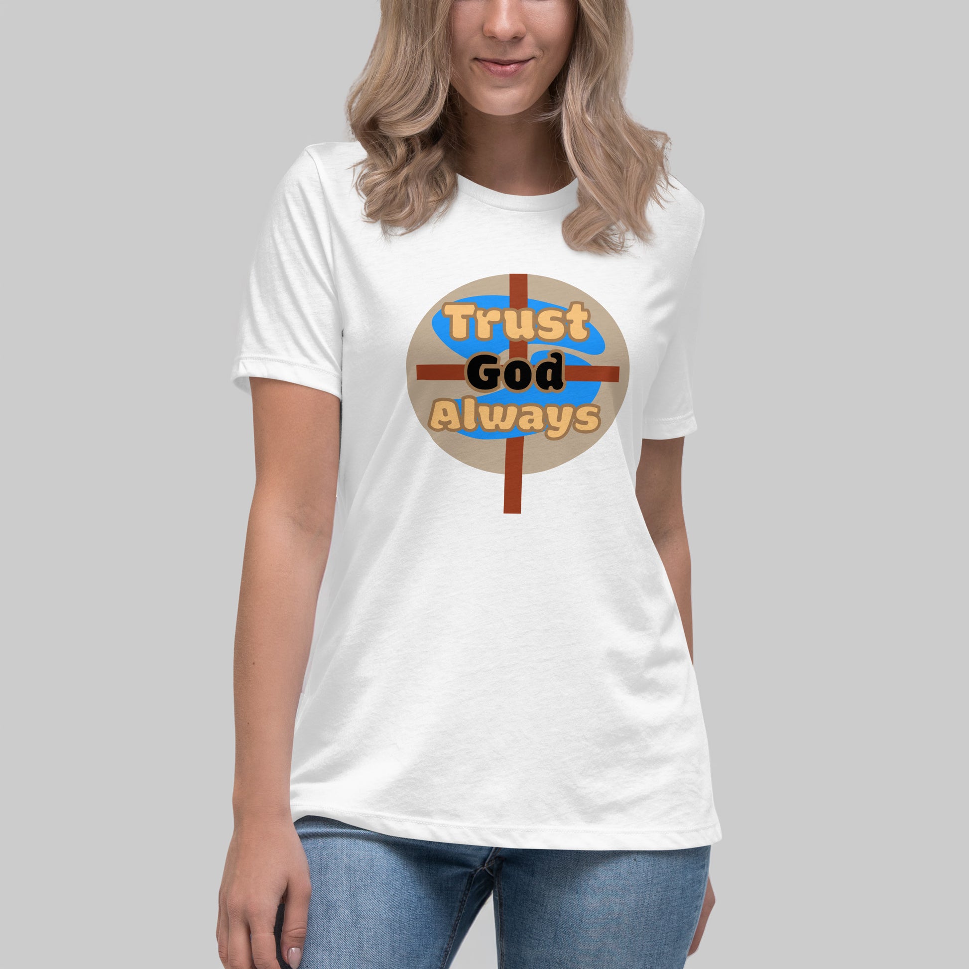 Share your devotion to your Christian faith with this simple Trust God crew neck Christian t-shirt for women. It has a comfy, smooth and soft feel with a relaxed fit that's perfect for wearing at home, at church, eating out or doing errands around town.